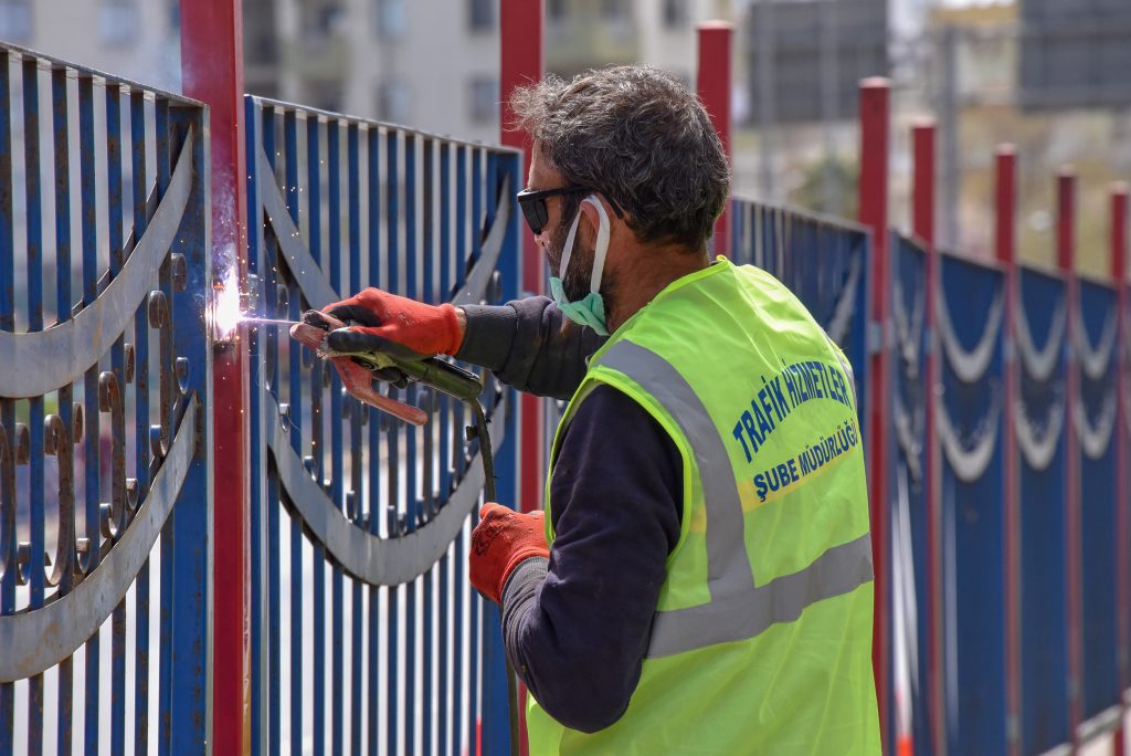 Mersin Büyükşehir Belediyesi Ulaşım Dairesi ekipleri, yol ve yaya güvenliği için kentte ihtiyaç duyulan noktalarda yaya korkuluğu yerleştirme çalışması yapıyor. Yerleştirilen demir korkuluklar Park ve Bahçeler Dairesi bünyesinde bulunan atıl malzemeler geri dönüştürülerek yapılıyor.