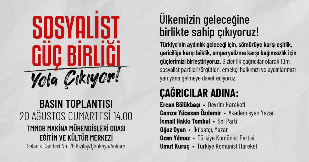 20 Ağustos Cumartesi günü 14.00’te Ankara’da TMMOB Makina Mühendisleri Odası Eğitim ve Kültür Merkezi’nde bir basın toplantısı yapılacağının duyurulduğu çağrı metni şöyle: